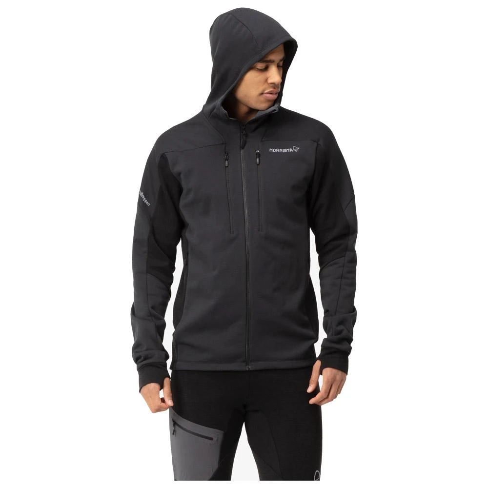 Die Trollveggen Powerstretch Pro Kapuzen-, Isolier- und Softshelljacke von Norrona bietet einen Cocktail an Funktionen, um Temperaturschwankungen beim Bergsteigen zu begegnen. Die Kombination aus Polyester und Wolle am Rücken und im Achselbereich sorgt für eine hervorragende Thermoregulation sowie ein effektives Geruchsmanagement. Das Powerstretch Pro-Material sorgt für eine gute Strapazierfähigkeit und schnell trocknende Eigenschaften. Die Jacke verfügt über Ärmelbündchen mit Daumenschlaufen, 4 Taschen (2 Brust- und 2 Seitentaschen) und eine helmtaugliche Kapuze. Die Powerstretch Pro Kapuzenjacke ist nach Öko-Tex und Bluesign zertifiziert und ist der perfekte Begleiter für Ihre Bergtouren, wobei die Herstellung umweltfreundlich ist und die Arbeitsbedingungen der Arbeiter respektiert werden.
